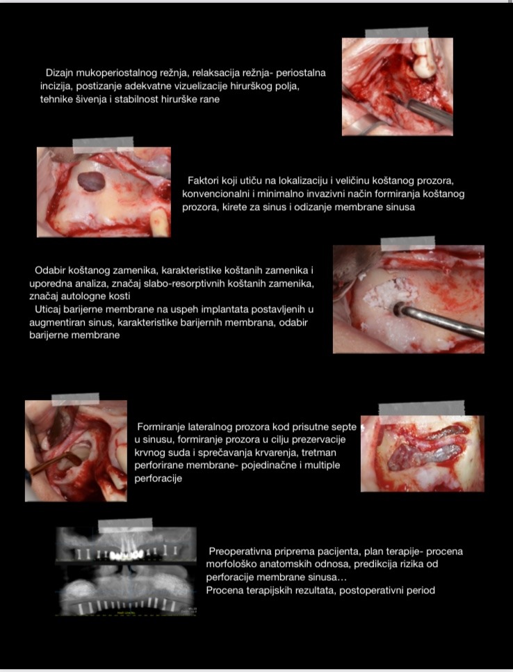 (dizajn režnja, formiranje lateralnog prozora – konvencionalni i minimalno invazivni pristup, podizanje membrane sinusa sa augmentacijom poda sinusa – model jagnjeće glave).
